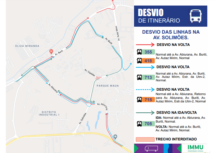 As linhas de ônibus 355 e 418 vão seguir normalmente até a avenida Abiurana, depois até a avenida Buriti, avenida Autaz Mirim e seguem o itinerário normal.