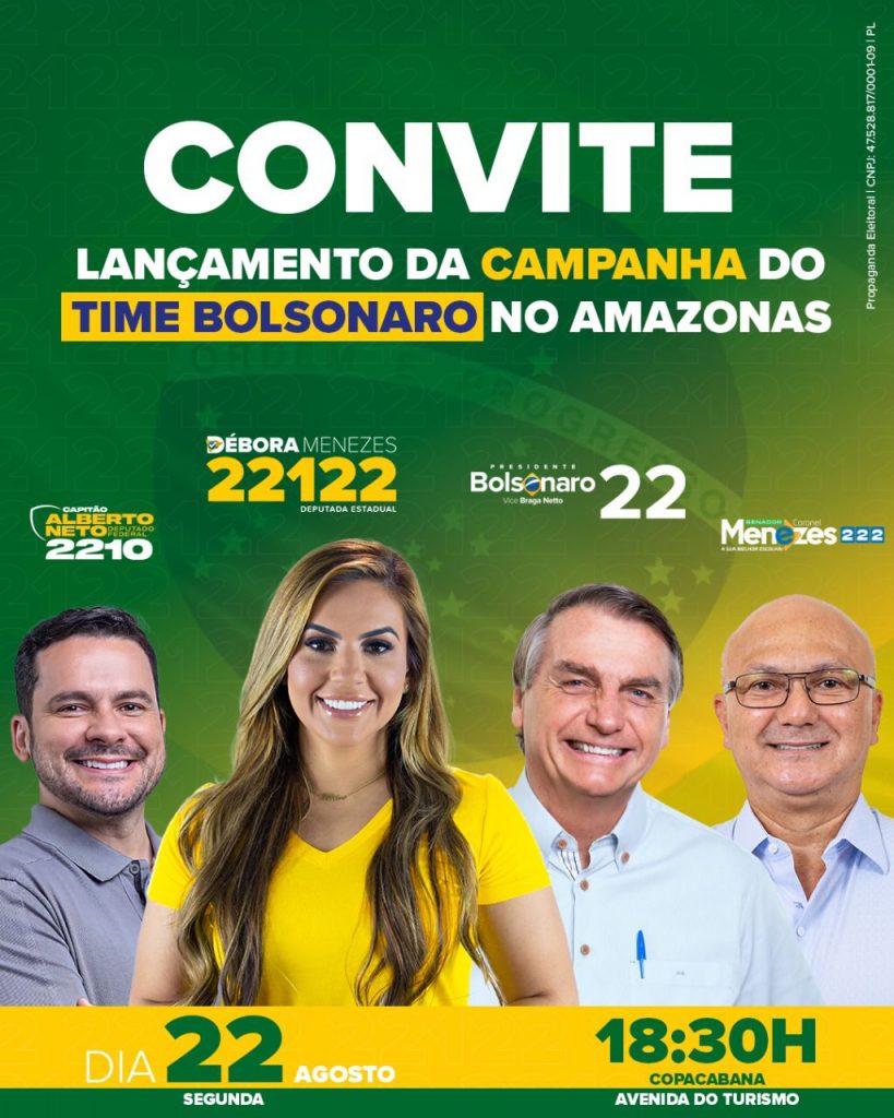 A Advogada de 28 anos, Débora Menezes, lança oficialmente sua candidatura a Deputada Estadual pelo Partido Liberal (PL), nesta segunda-feira, 22, ao lado do candidato à reeleição, deputado federal Capitão Alberto Neto, e o candidato ao Senado Federal Coronel Menezes. A cerimônia marca o lançamento da candidatura à reeleição do Presidente Jair Messias Bolsonaro pelo Partido Liberal (PL) e do time apoiado por ele. O evento acontece na casa de eventos Copacabana, localizada na avenida do Turismo, zona oeste de Manaus com horário de início confirmado para às 18h30.