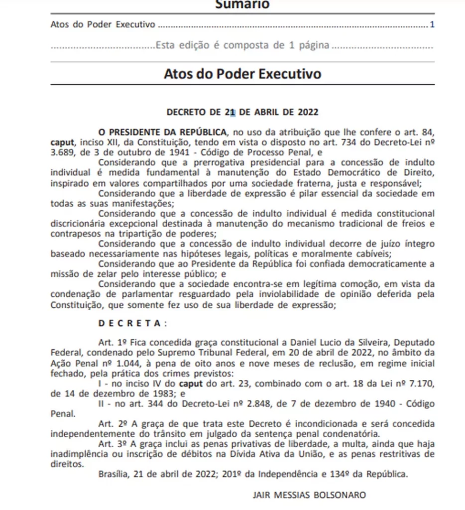 Bolsonaro usou o artigo 734 do Código de Processo Penal, segundo o qual o presidente da República pode conceder “espontaneamente” a graça presidencial. Diz o artigo: